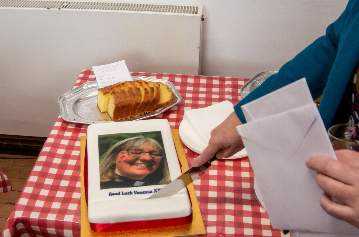 She goes with our thanks and best wishes and prayers for her future. Vanessa is joining Winchester University as their new chaplain. As you can see from the pictures, we couldn’t let her go without a presentation of cards, flowers and a token of our appreciation. Also, a cake with her face printed on it, which Vanessa managed to cut very carefully.